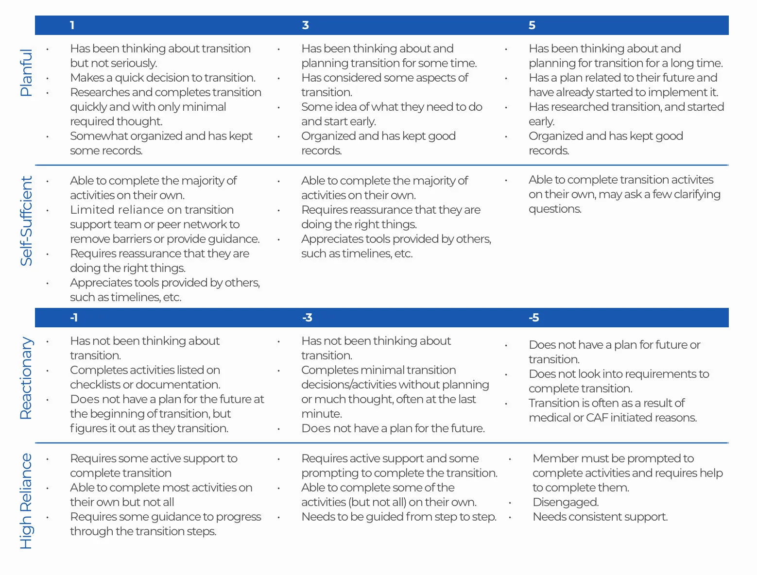 Potential traits should be identified and collected through initial research. While many traits may fit your users, it was helpful for me to consider our context; our goal is to create a digital solution to support members transitioning out of military service. We identified how self-sufficient (or reliant on others) and how planful (or reactionary) members are as it relates to their transition.